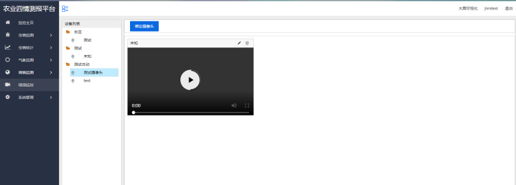監控主頁顯示設備列表、大屏可視化、地圖展示等菜單信息。顯示土壤墑情、蟲情、氣象監測圖標及設備的運行狀態。